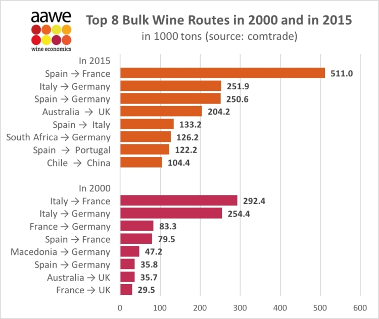 En contraposición, en 2015, Francia ya no tiene ninguna ruta de exportación de vino a granel entre las 8 primeras e Italia solo tiene una. Sin embargo, España tiene 4.