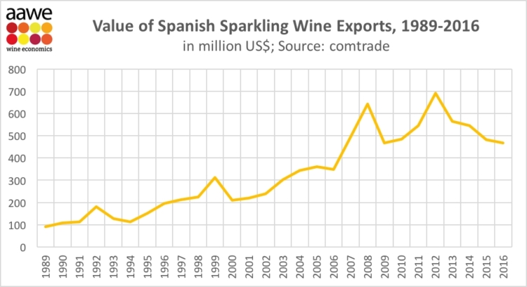 Las exportaciones españolas de vino espumoso siguen cayendo como se puede ver en el siguiente gráfico. Una caída que lleva ya desde el 2012 y que representa en este momento a las exportaciones. No hablamos en ningún momento de las cifras de ventas dentro del mercado español.