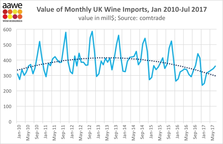 Las importaciones de vino británicas siguen cayendo como se puede ver en el gráfico que presenta Wine Economics.