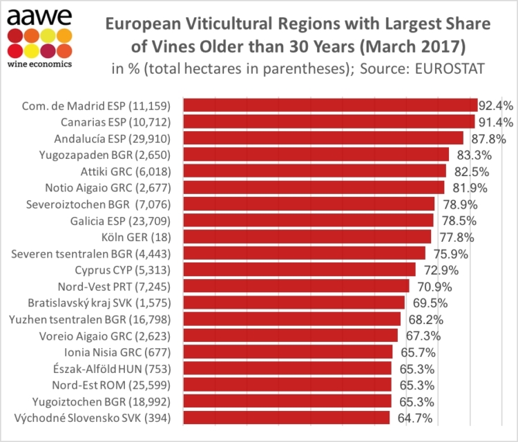 El gráfico permite dos lecturas para que os orienteis. Por un lado, entre paréntesis, sale el número de hectáreas de viñedo de más de 30 años. Ahí se encuentra en primer lugar Andalucía, seguida de Nor-Est en Rumanía y Galicia en España.