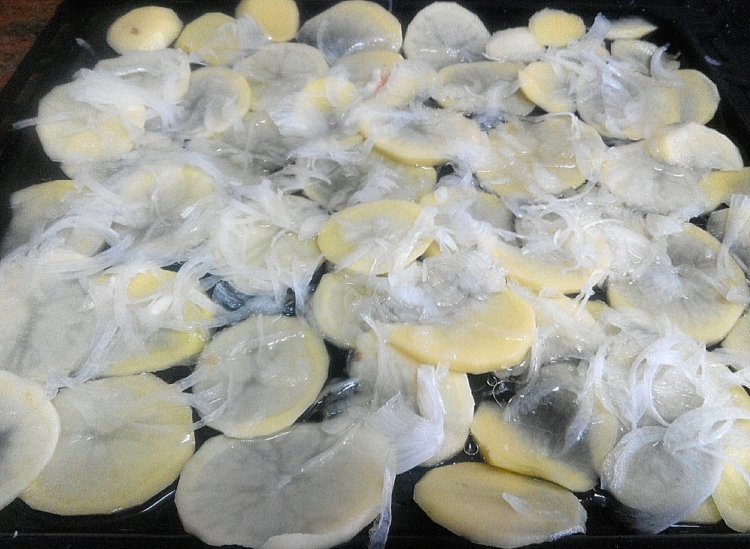 Cortamos las patatas en rodajas muy finas y las ponemos en una bandeja de horno. Picamos muy fina la cebolla por encima. La salamos y añadimos dos cucharadas de aceite y el vaso de vino blanco. Echamos una pizca de perejil y las hierbas provenzales y lo metemos al horno a 175º unos 20 minutos o menos si vemos que se nos están cogiendo mucho color.