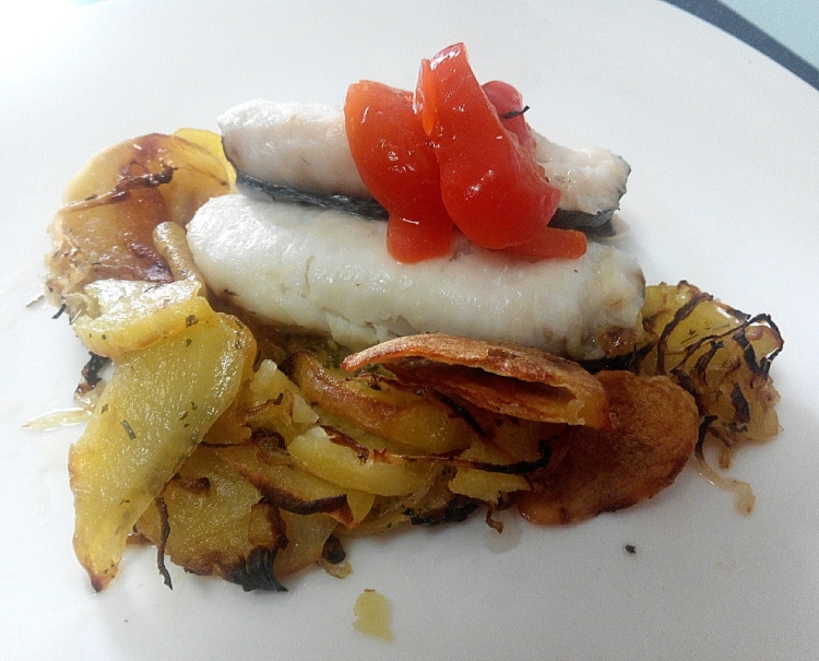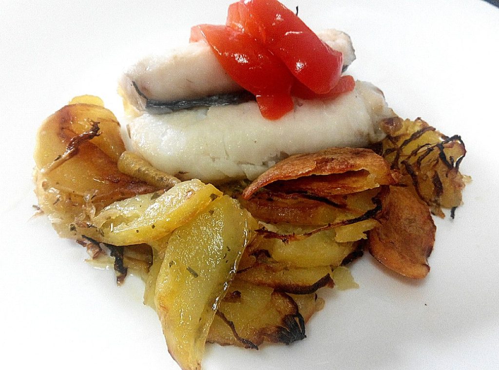 Lomos de merluza al vino blanco con patatas al horno especiadas y Verdejo joven