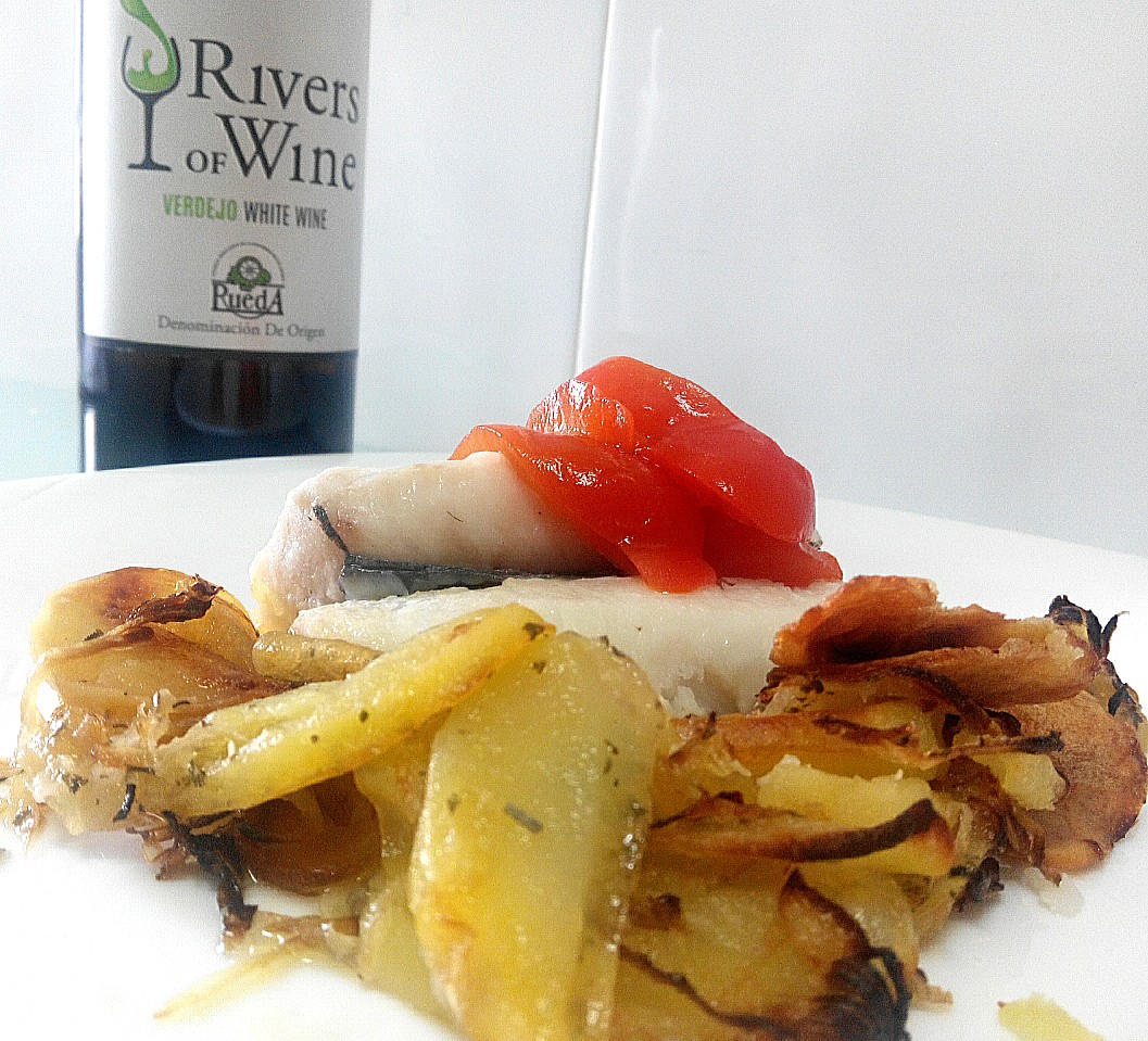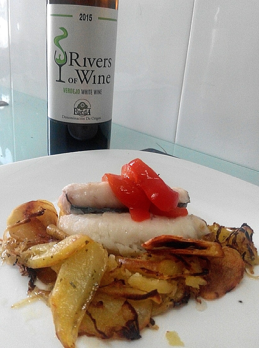 Lomos de merluza al vino blanco con patatas al horno especiadas y Verdejo joven. Es la combinación que os traemos hoy en nuestro blog de maridajes. Ya habíamos maridado en otras ocasiones merluza en arias recetas y preparaciones con Albariños. Hoy hemos optado por un Verdejo joven, Rivers of Wine 2015. El toque especiado que le hemos dado a las patatas al horno creemos que sale muy reforzado por Verdejo que por otros vinos blancos.