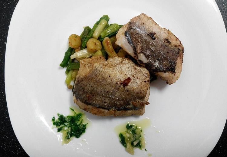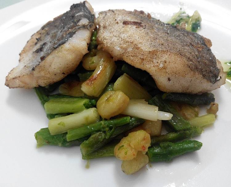 Lomos de merluza sobre trigueros, ajetes y gambas con vino joven Albariño
