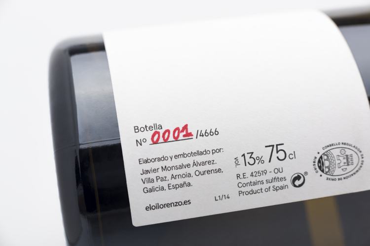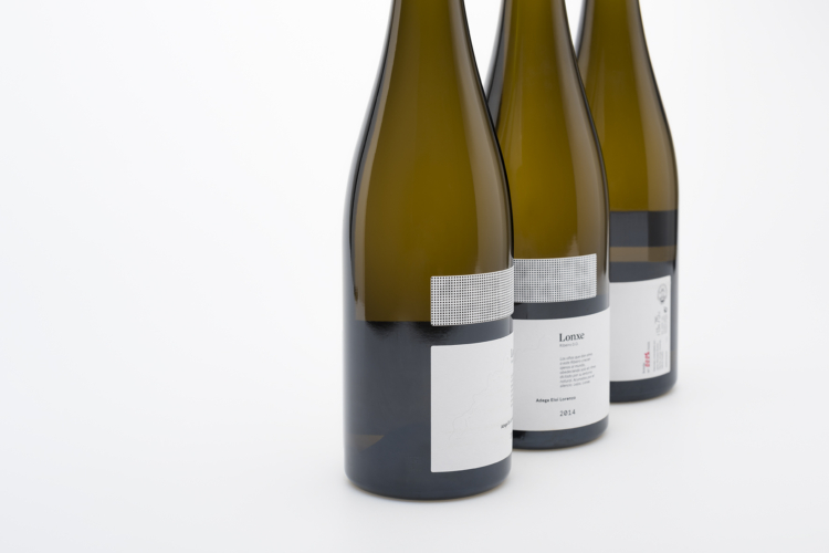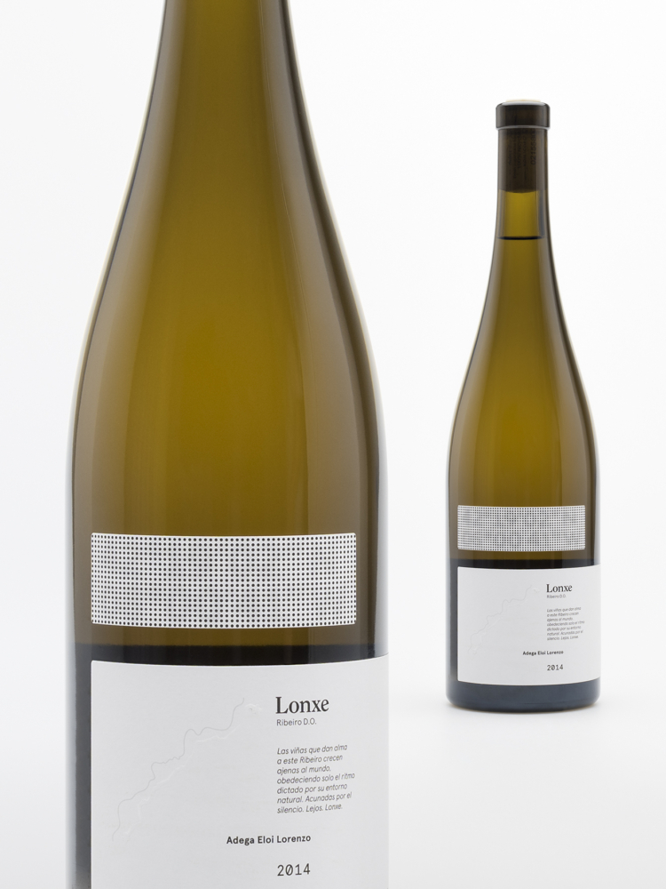 Bajo este concepto /lejos/, Lonxe presenta una imagen gráfica que sólo se ve desde la distancia. Al alejar la botella, se pueden distinguir las coordenadas 42º19’02’’N 08º00’41’’E en la etiqueta, la localización exacta donde están situadas las viñas dentro de la finca.
