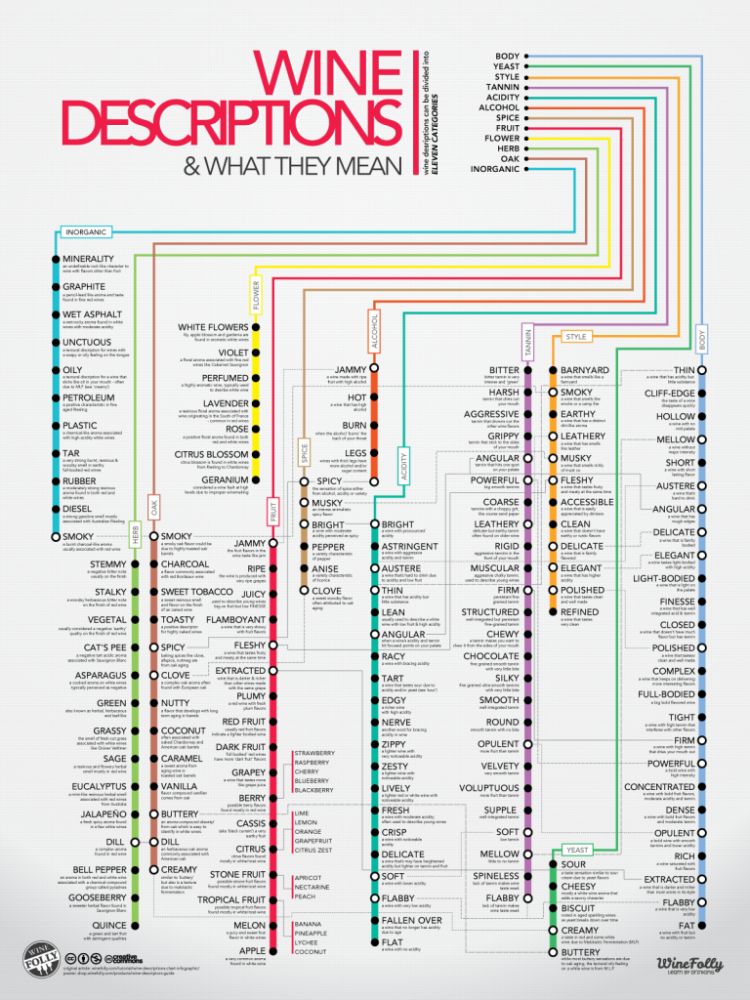 Los 120 términos más comunes para describir un vino, y mira que mucha gente le llega con decir si le gusta o no el vino cuando le da un sorbo a la copa. Pues en esta infografía se recogen los 120 términos más habituales a la hora de describir un vino.