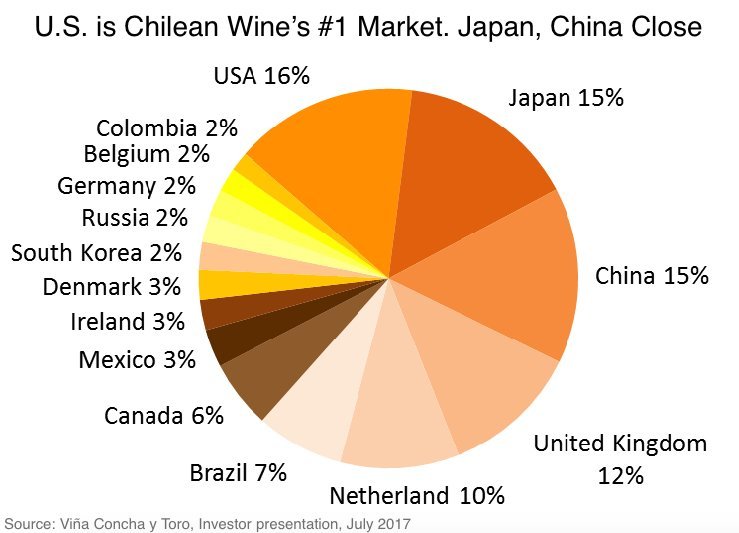 USA sigue siendo el principal mercado de los vinos chilenos, pero seguido muy de cerca de Japón y China (16% y 15% los dos países asiáticos respectivamente).