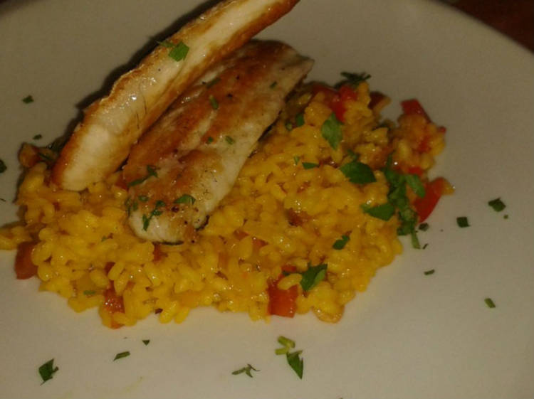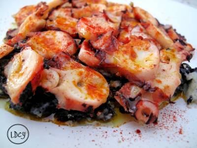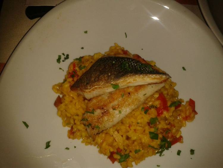 Lubina a la parrilla sobre arroz con sepia