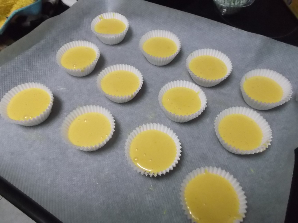 Ya está todo. Echamos en los moldes (no como nosotros) y lo meteremos al horno que hemos precalentado a 180º.