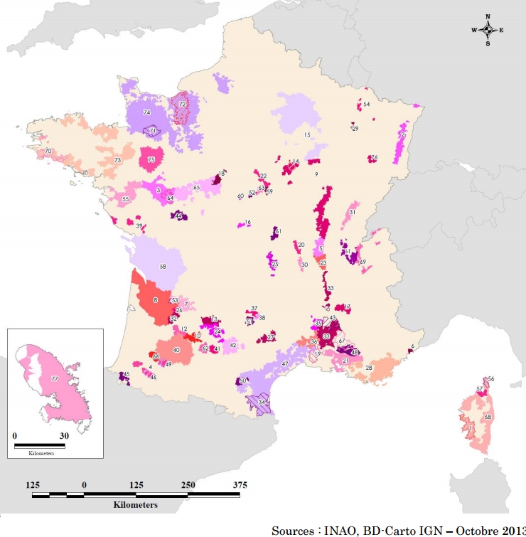 329 zonas reconocidas como AOC dentro de las 77 demarcaciones o denominaciones dentro del vino francés y otros alcoholes.