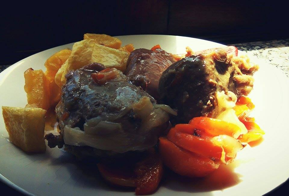 Guarnición: 6 patatas medianas cortadas en cuadrados fritas y pimientos del piquillo.