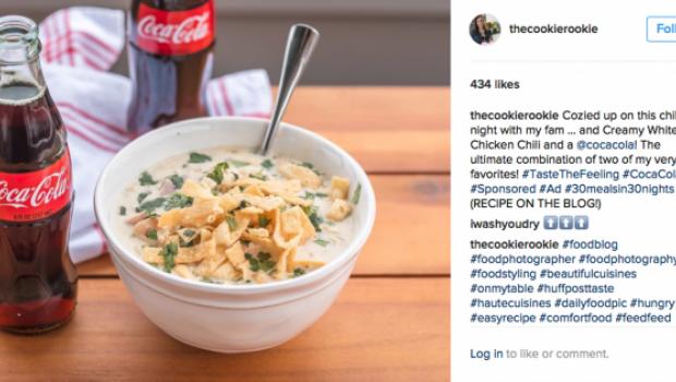 Los bloggers de alimentos fueron pagados para publicar fotos en Instagram de varios platos, emparejado específicamente con las botellas de vidrio de Coca-Cola. Una foto mostraba un tazón de chili de pollo con el refresco. (fuente Jacksonville.com)
