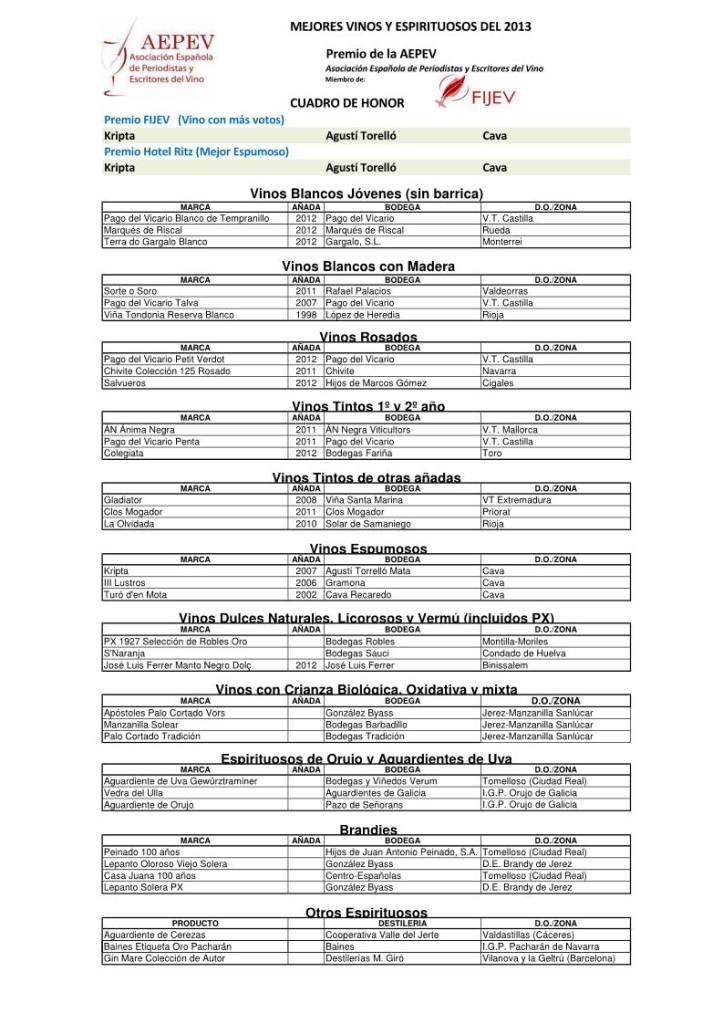 Mejores vinos y espirituosos del 2013 para la AEPEV, o sea, de la Asociación Española de Periodistas y Escritores del Vino que en esta quinta edición de este evento han dado 34 galardones, correspondiendo 24 a vinos y otros 10 a espirituosos, dentro de más de 900 vinos que se han valorado.