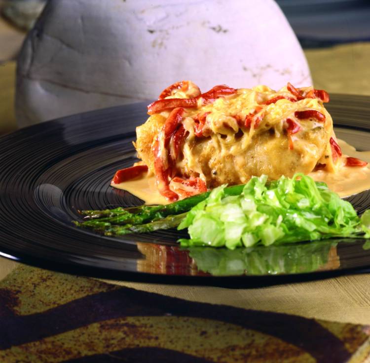 Para la salsa: cortar la otra parte de cebolla en juliana, poner a pochar en aceite y añadir los Pimientos Asados del Bierzo troceados. Escurrir el aceite y añadir la nata líquida, una pizca de pimentón y sal. Dejar que la nata se reduzca y flamear.