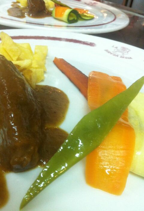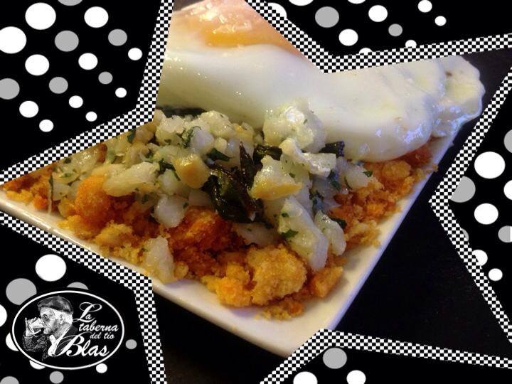 Migas, huevo, bacalao y pimiento verde es la tapa que el día de la felicidad tenían en especial nuestros amigos de La Taberna del Tío Blas en la calle Laurel de Logroño.