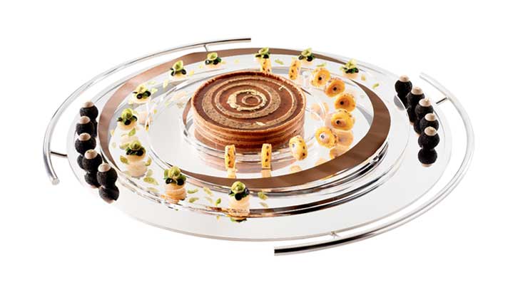 España apostó por la tradición y presentó la carne, una pintada con crep de manzana y huevos con cáscaras comestibles, sobre una bandeja metálica en forma de bata de cola.