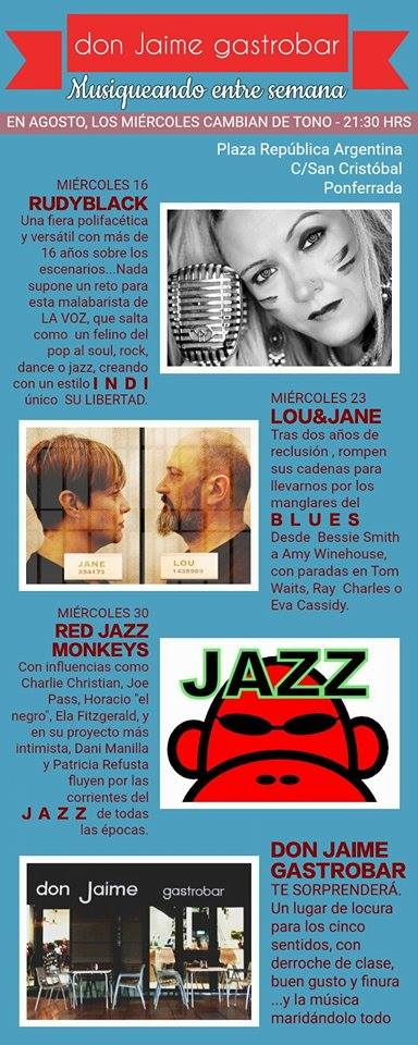 Es esta ocasión los amigos de Don Jaime Gastrobar nos presentan tres nuevos conciertos para los miércoles tarde/noche de los próximos tres miércoles de este mes de agosto y que podremos disfrutar acompañados de la oferta gastronómica amplia y variada que nos ofrecen desde este establecimiento ponferradino.