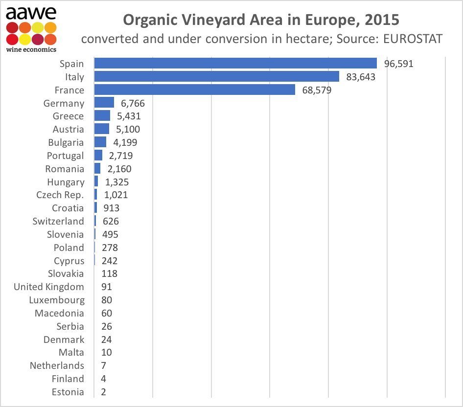 Esto tiene relativo interés ya que nos falta por saber cual es la superficie total de viñedos de cada país para saber que porcentaje de los mismos se destina a este tipo de viticultura.