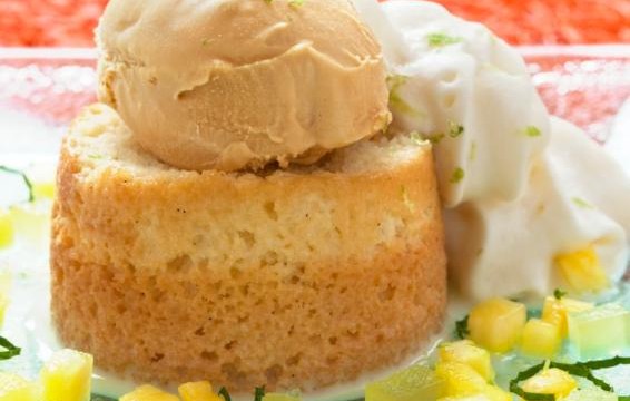 Cuando este listo para servir, ponga un pedazo del pastel, o dos pedazos del molde de cupcake, en cada uno de los 6 platos. Ponga una cucharita del helado de dulce de leche encima de cada pastel, agregue la nata alrededor y decore con piña y cascara de lima.