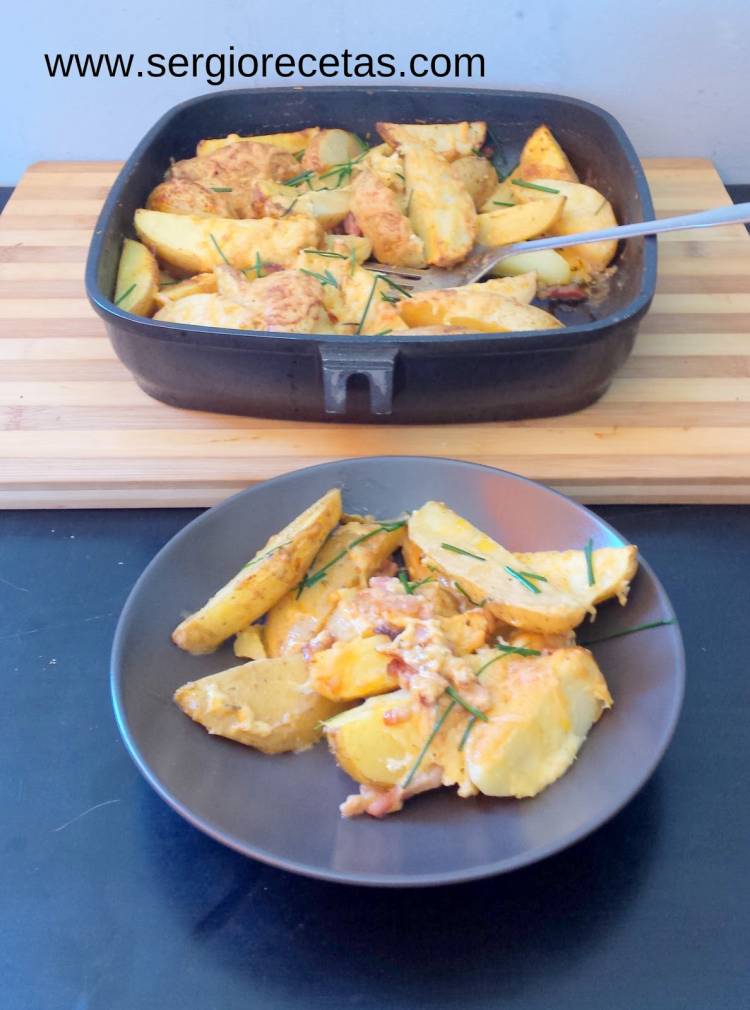 Ponemos una bandeja para el horno a fuego fuerte con unas 2 cucharadas de aceite de oliva, añadimos los ajos enteros aplastados que se vayan dorando y el bacon para que suelte todo su sabor, cuando lo tengamos bien crujiente añadimos las patatas especiadas y dejamos que tomen un poco de color al fuego, añadimos la nata y rallamos el queso sobre las patatas directamente de manera abundante, cuando comience a hervir las introducimos al horno a 180ºC durante 45 minutos.