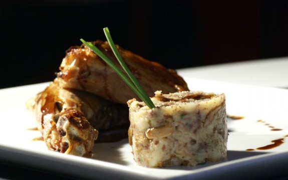 Comenzamos por la carne, para ello cortamos las piernas en cuatro trozos y las envasamos al vacío con leche, aceite, tomillo y sal. Cocinar a 80º en horno de vapor o Roner durante 8h. Una vez acabada la cocción, enfriar rápidamente con agua con hielo y reservar. Ya veis que es una receta de larga preparación típica para alguna celebración.