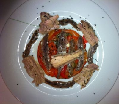 Colocar los Pimientos Asados del Bierzo en tiras y las anchoas en un plato radialmente y en el centro la ventresca.