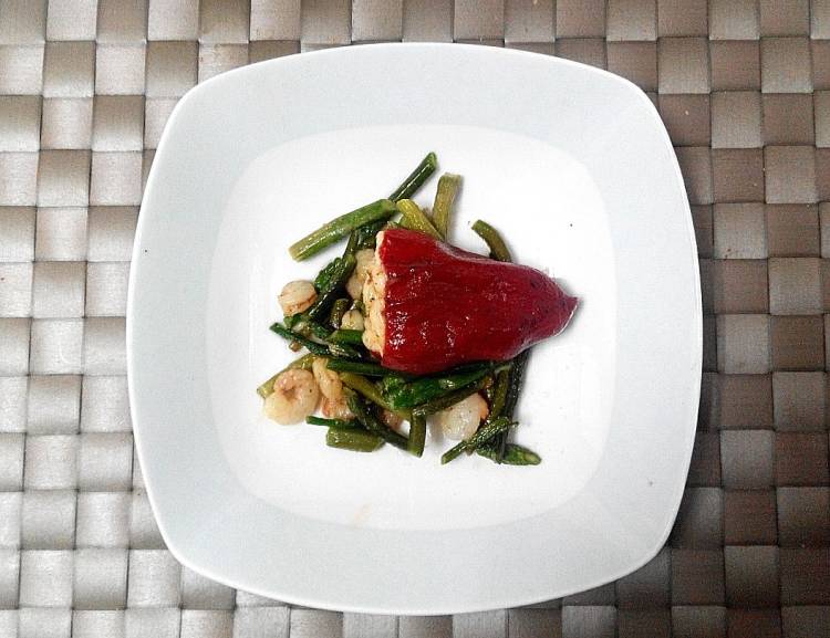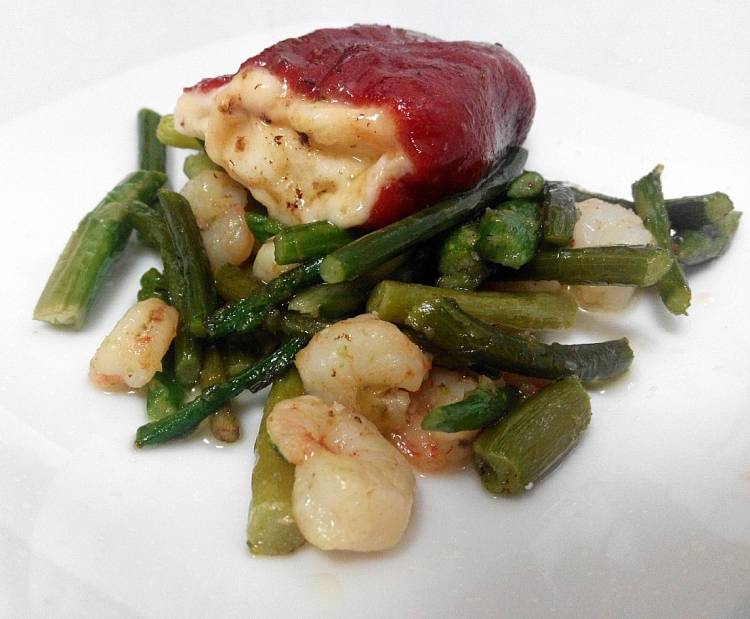 Pimientos del piquillo rellenos de brandada de bacalao sobre trigueros ajetes y gambas 3