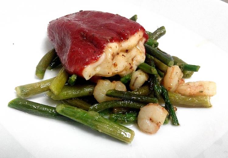 Pimientos del piquillo rellenos de brandada de bacalao sobre trigueros ajetes y gambas