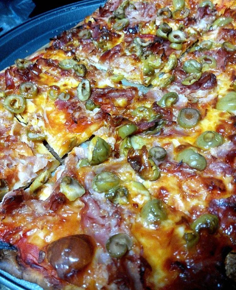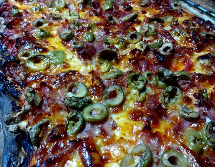 Pizza de jamón serrano, champiñones y pimiento verde