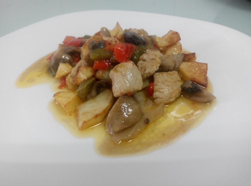 Pollo salteado de champiñones y pimientos al vino blanco 1