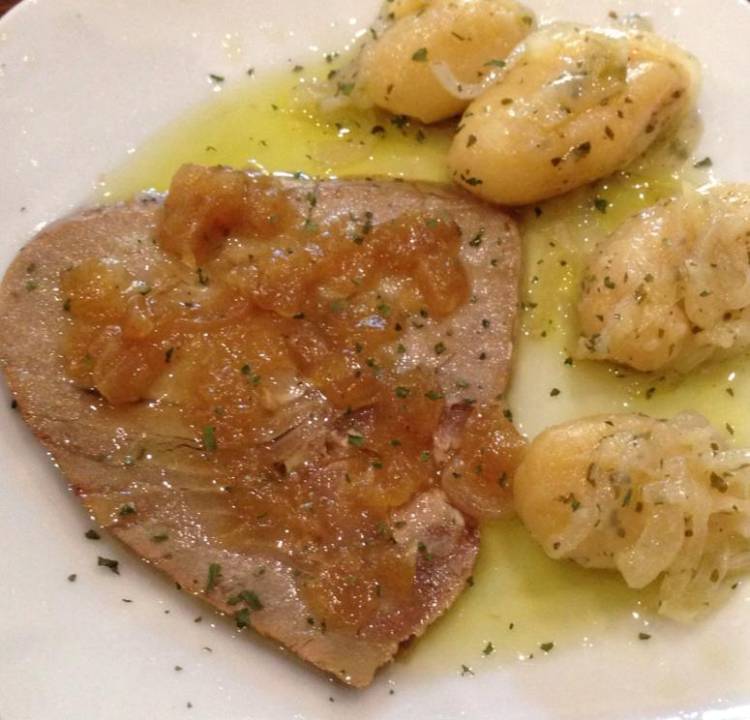 Por otro lado se pone una salten con aceite y cuando está bien caliente se fríe el bacalao pasado por harina; cuando esta todo frito ese aceite se cuela por un colador y se pone un poco en la sartén para hacer el sofrito del bacalao.