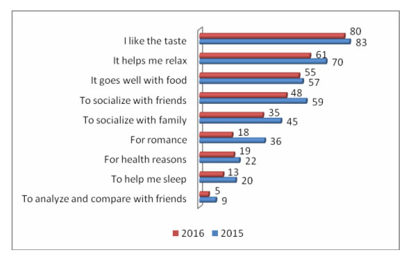 Porque les gusta catarlos y saborearlos, se mantiene como el primer motivo. Para ayudar a relajarse sigue en segundo puesto reduciendo el porcentaje, al igual que el que lo quiere para realizar un maridaje con alguna comida.