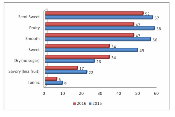 Aun bajando con respecto al año anterior, los vinos semidulces, encabezan las preferencias de los bebedores estadounidenses. Desbanca de esta manera a los que preferían vinos afrutados en el año 2015, que ahora pasan al segundo lugar, empatados con los que prefieren buena boca (smooth), es decir, un buen paso por boca, redondo y equilibrado.