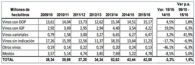 De esos 42 millones de hectolitros, 37,2 millones corresponden a producción de vino y 4,8 millones a mostos. Aumenta la producción de vinos con DOP (+4,5%), de los vinos con variedad (+3,2%) y de los vinos con IGP (+19%), mientras cae la de los vinos sin ninguna indicación (-17,7%) y la de otros vinos.