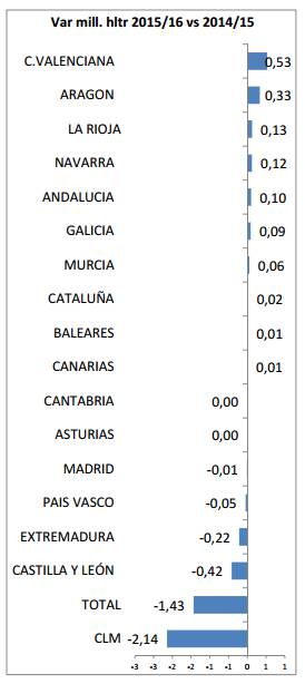 Previsión de 42 millones de hectolitros de vino y mosto para la campaña 2015/2016 en España. Las Comunidades Autónomas declaran una producción de 42 millones de hectolitros para la campaña 2015/2016.