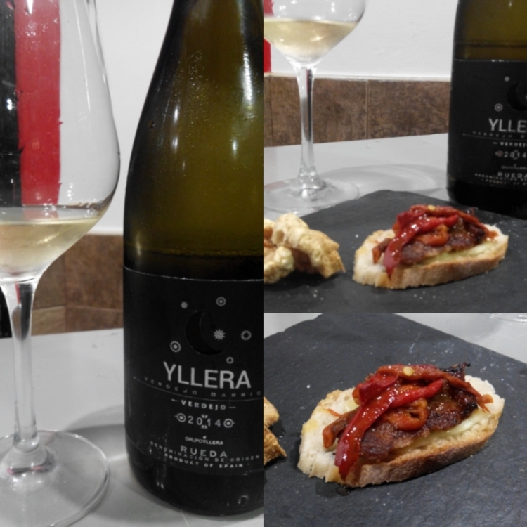 Lo seguimos de otro Verdejo de esta bodega. Se trata del vino con crianza sobre lías denominado como Verdejo Barrica 2014, al que hemos querido proponerle un maridaje con algo de fuerza, por eso hemos elegido un pincho de secreto ibérico con pimientos asados del Bierzo.