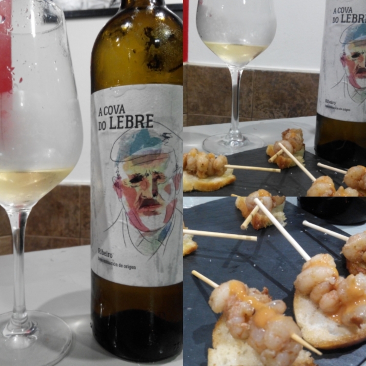 El segundo vino que catamos fue el A Cova do Lebre. Un vino elaborado en la DO Ribeiro que tiene en su coupage mayoritariamente Treixadura con un porcentaje de Godello y oro pequeño de Torrontés. Un vino de los considerado de autor, con una producción muy reducida que hemos maridado con una brocheta de gambas.