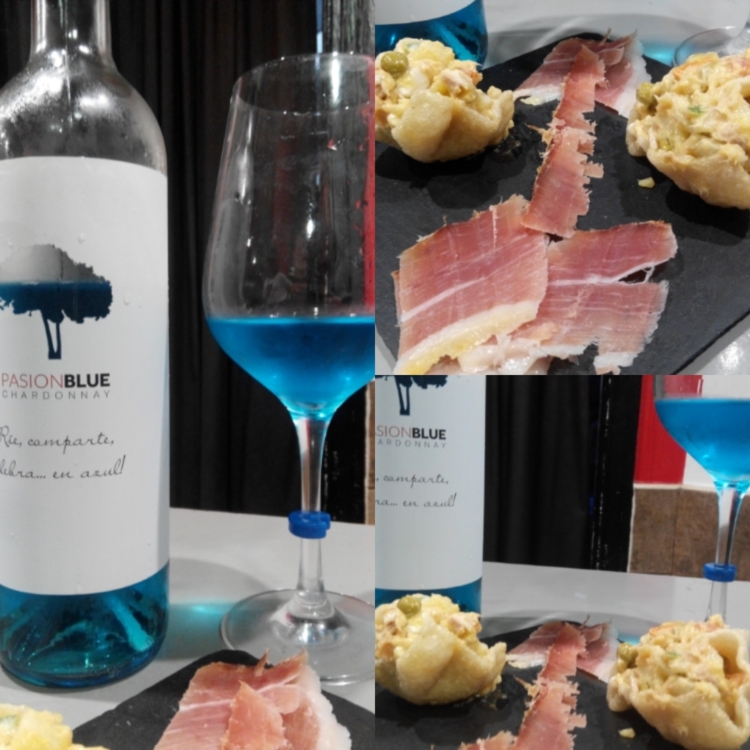 En tercer lugar, y como una sorpresa de la noche, hemos catado el Pasión Blue Chardonnay. Un vino, o bebida elaborada a base de vino, que pese a su color, es elaborado con uvas de la varietal blanca Chardonnay. Fresco y muy actual en su elaboración, fue maridado con una palometa de trigo y ensaladilla, acompañado con un toquecito de jamón.