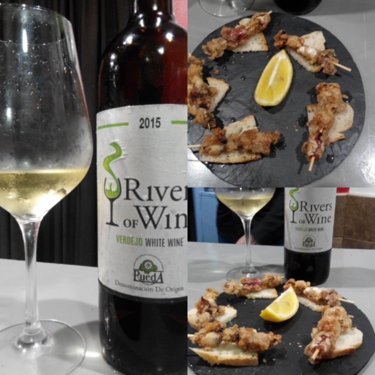 A continuación continuamos con los verdejos de la mano del vino Rivers of Wine 2015. Un monovarietal Verdejo sin crianza que, a nuestro modo de ver, a pesar de ser un vino joven, está en estos momentos en su plenitud, con lo cual es un verdadero placer disfrutar de una cata de este vino. Lo hemos maridado con una brocheta de puntillas de calamar.
