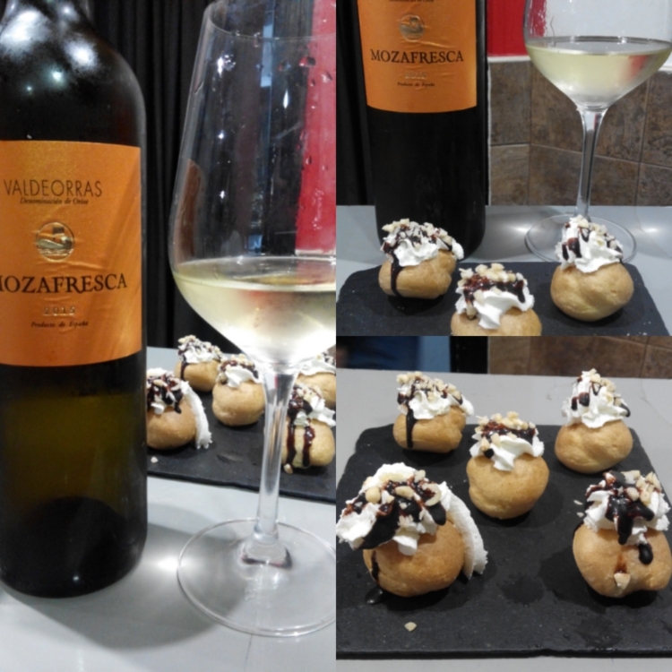 Y por último, para cerrar nuestra primera cata de vinos de la primavera, hemos decidido catar un vino que nos ha parecido ideal para maridarlo con un pincho dulce. Se trata del vino Mozafresca 2015, un vino adscrito a la DO Valdeorras. Lo hemos maridado con unos profiteroles de nata y chocolate. Una guinda dulce para terminar nuestra cata con un 'postre'.