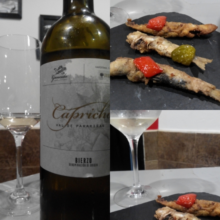 El primer vino de nuestra primera cata fue el Capricho, elaborado por Bodegas Gancedo. Hemos catado la añada del 2015 y estamos esperando poder probar la del 2016. Estamos hablando de un monovarietal Godello elaborado en el Bierzo. Para el maridaje hemos elegido unas parrochitas (sardinas pequeñas) con pimientos fritos. Una combinación ideal como inicio de la cata.