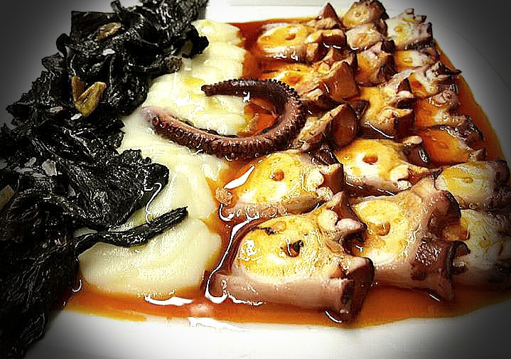 Pulpo á feira sobre crema de patatas y trompetas de los muertos