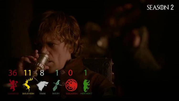 Aquellos que seáis seguidores de esta serie, Juego de Tronos, seguro que os habéis fijado que en muchas ocasiones los protagonistas aparecen con una copa de vino en la mano. pero, por curiosidad, ¿sabéis cual es la familia que a lo largo de las cuatro temporadas parece más veces con un vaso de vino en la mano? ¿ Lannister, Stark, Baratheon,...?