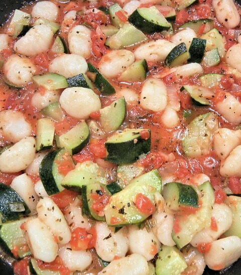 Se sofríen en una sartén, primero los ajos, después la rebanada de pan, una vez frita se deja en un plato con un poco de agua para que empape, y por últimos las almendras que previamente se han escaldado para quitarles la piel. Con estos ingredientes y la pimienta se hace un majado en un mortero y se aparta. A la vez se hace un sofrito con el tomate y la cebolla, con el aceite que nos ha quedado de freír lo anterior, se reserva.