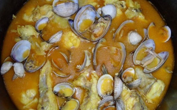 Se echan las gambas en una cazuela y se le añade en refrito, el majado y el azafrán, se cubren de agua, se dejan hasta cocer a fuego lento unos 10 minutos para a continuación echarle el rape, los berberechos y las almejas, se prueba de sal y se deja cocer unos 10 minutos más.