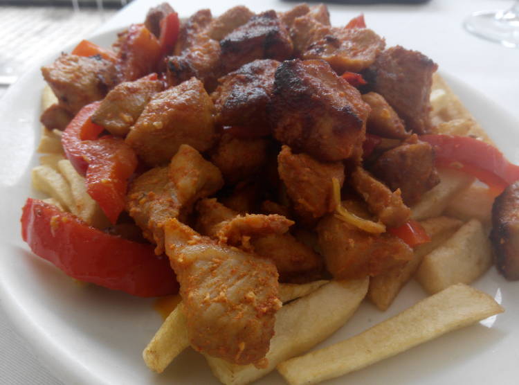 Con o sin vino está espectacular. Añadimos patatas fritas y pimiento rojos (estos últimos opcionales).
