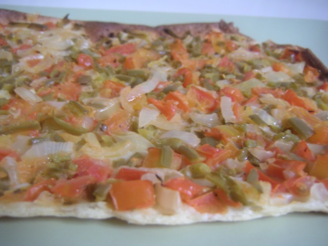 - Cortar del mismo modo los pimientos y las cebollas, mezclar con el tomate y repartir por encima de la masa de pan que habremos estirado con ayuda del rodillo.