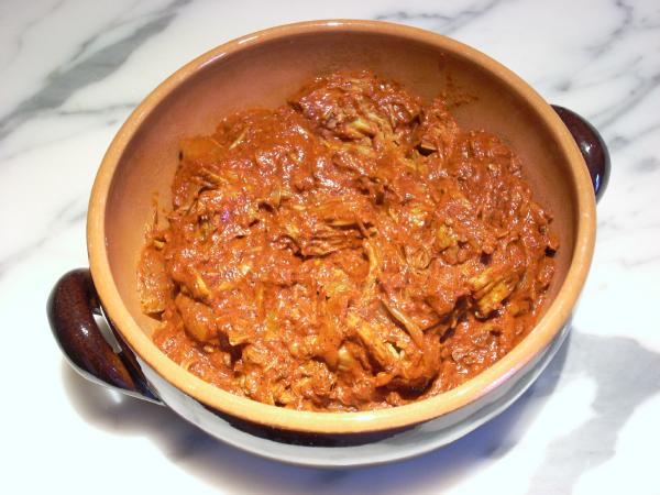 - Se tapa con la hoja de plátano o papel aluminio y se mete al horno por espacio de 3 horas y se baña cada vez con el jugo a una temperatura de 180º, se saca del horno hasta que la carne se pueda deshenebrar