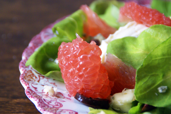 Receta de ensalada de pomelo espinaca y palta, con choux relleno de mousse de langostino