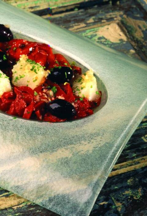 - Repartir las aceitunas partidas por la mitad, las alcaparras, espolvorear con el orégano, aliñar con aceite y cocer a horno medio durante unos 30 minutos.